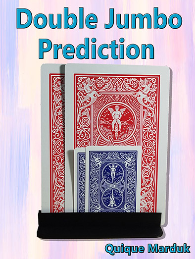 On the table, the magician displays a stand holding two Bicycle Jumbo cards with their backs facing the audience.